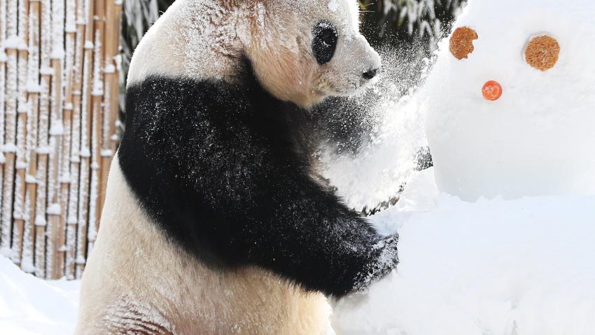 Στον ζωολογικό κήπο Έβερλαντ της Νοτίου Κορέας ένα πάντα παίζει με χιονάνθρωπο.