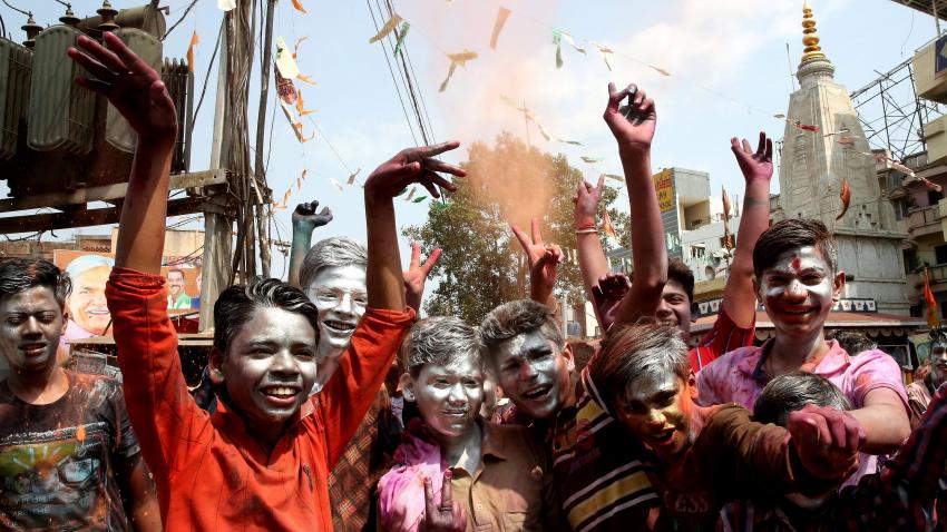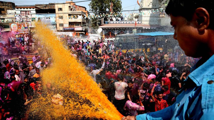 Iνδοί χορεύουν και διασκεδάζουν χρησιμοποιώντας χρωματιστές σκόνες στη διάρκεια του φεστιβάλ Holi στην πόλη Bhopal. Είναι μια γιορτή για το τέλος της χειμερινής περιόδου, την τελευταία μέρα του φεγγαριού του σεληνιακού μήνα Phalguna, που συνήθως πέφτει στο τελευταίο μέρος του Φεβρουαρίου ή του Μαρτίου και γιορτάζεται από ανθρώπους που ρίχνουν έγχρωμη σκόνη και έγχρωμο νερό ο ένας στον άλλο.