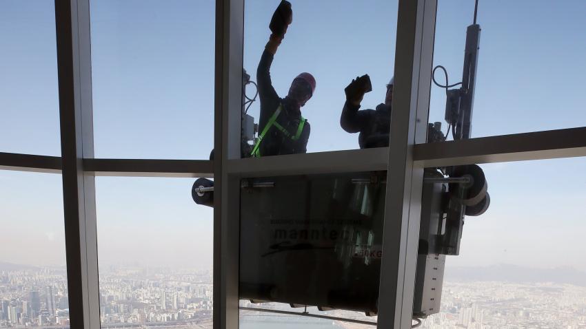 Επαγγελματίες καθαρίζουν τα τζάμια του Lotte World Tower στη Σεούλ της Κορέας. Το κτίριο έχει 123 ορόφους και περίπου 42,000 τζάμια. Για τον καθαρισμό τους απαιτούνται τουλάχιστον 720 ώρες το χρόνο.