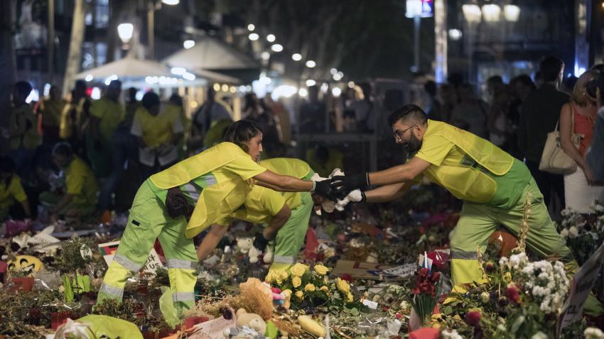 Οι υπηρεσίες του Δήμου της Βαρκελώνης καθαρίζουν τα λουλούδια στο χώρο που δημιουργήθηκε εις μνήμη των θυμάτων της πρόσφατης αιματηρής επίθεσης.