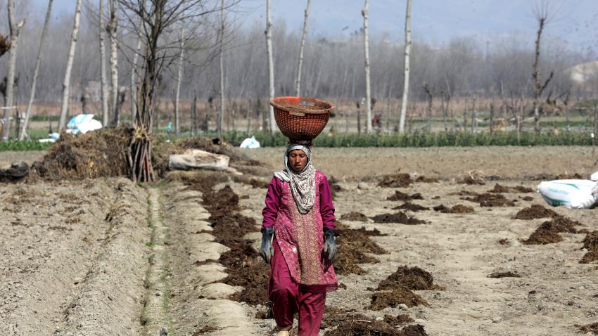 Mία γυναίκα στο Κασμίρ της Ινδίας κουβαλά κοπριά αγελάδας σε καλάθι στο κεφάλι της.
