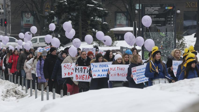 Φεμινίστριες από την Ουκρανία κρατώντας πανό διαδήλωσαν στο κέντρο του Κίεβου γιορτάζοντας την ημέρα της γυναίκας. Ζήτησαν πλήρη ισότητα και των δύο φύλων σε όλα τα θέματα.