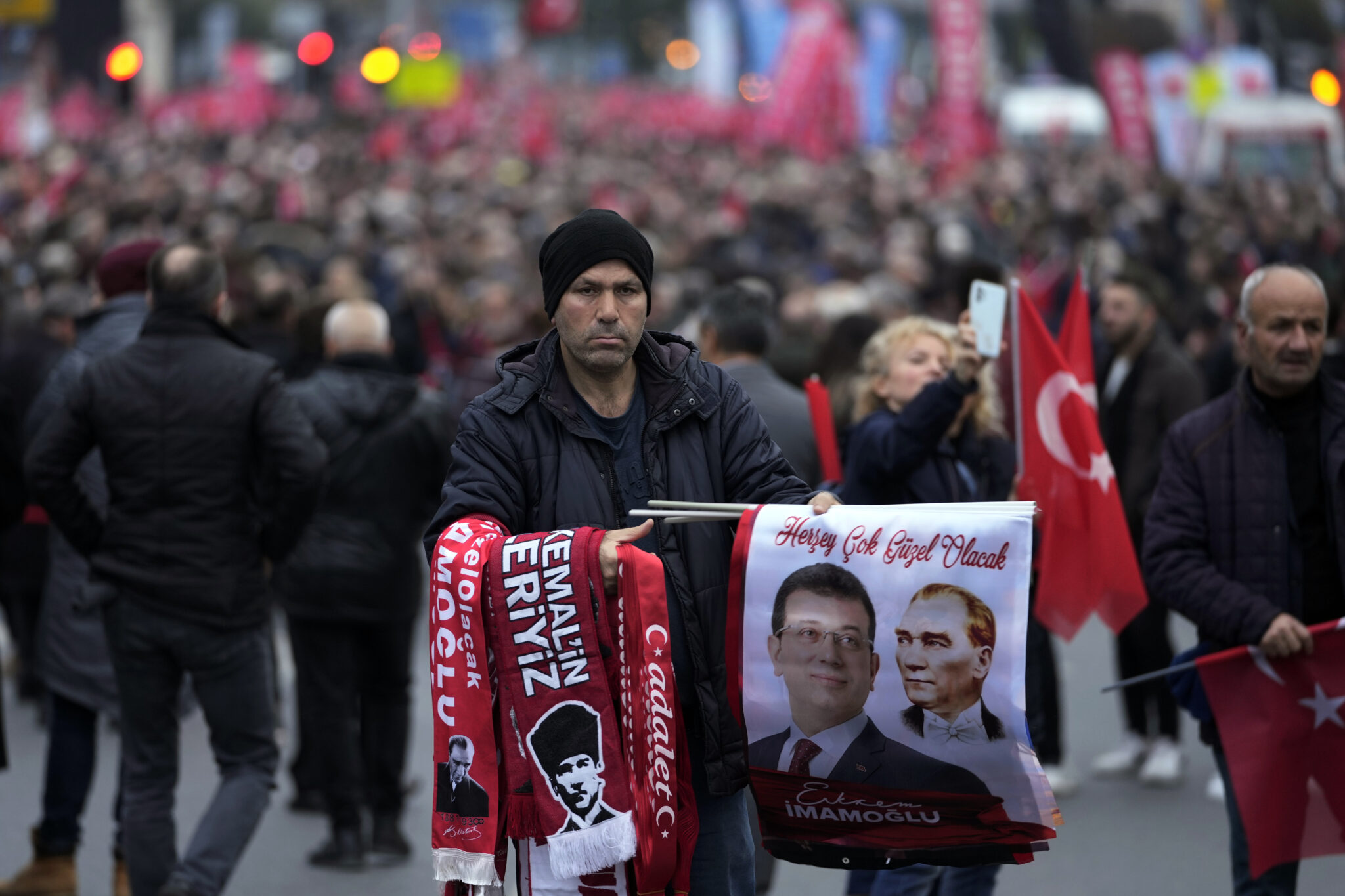 «Αυτή η δίκη είναι υπόθεση της χώρας, μαζί θα ξεπεράσουμε τις μαύρες μέρες, δεν θα λυπηθούμε, δεν θα θυμώσουμε, θα είμαστε αποφασισμένοι», δήλωσε ο Δήμαρχος Κωσνταντινούπολης Εκρέμ Ιμάμογλου στο μεγάλο συλλαλητήριο έξω από το Δημαρχείο Κωνσταντινούπολης με τη συμμετοχή των αρχηγών των κομμάτων της αντιπολίτευσης. Σύμφωνα με τα επίσημα στοιχεία της αστυνομίας στη συγκέντρωση συμμετείχαν 25 χιλιάδες άτομα, ωστόσο αντιπολιτευτικά μέσα αναφέρουν ότι βρέθηκαν εκατοντάδες χιλιάδες.