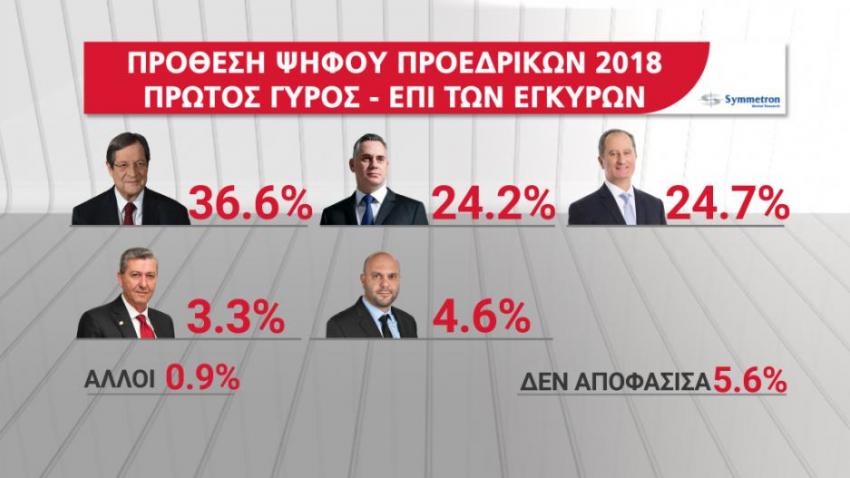 Δημοσκόπηση Alpha – Στην πρόθεση ψήφου επι των εγκύρων ψηφοδελτίων, ο Νίκος Αναστασιάδης συγκεντρώνει ποσοστό 36,6%, ο Σταύρος Μαλάς ποσοστό 24,7%, ο Νικόλας Παπαδόπουλος 24,2%, ο Χρίστος Χρίστου ποσοστό 4,6% και ο Γιώργος Λιλλήκας ποσοστό 3,3%.