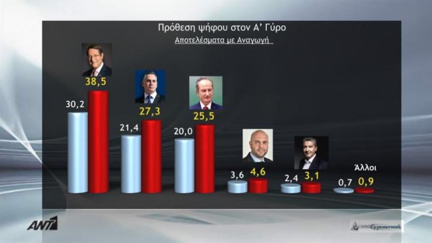 H πρόθεση ψήφου στη δημοσκόπηση του Ant1 δείχνει ότι ο Νίκος Αναστασιάδης καταγράφει 30,2% (από 26,3% τον Νοέμβριο και 29,1% τον Δεκέμβριο) και ο Νικόλας Παπαδόπουλος 21,4% (από 19,7% τον Νοέμβριο και 21,1% τον Δεκέμβριο) με διαφορά μόλις 1,4% (στατιστικό λάθος 3%) από τον Σταύρο Μαλά, που καταγράφει 20% (από 17% τον Νοέμβριο και 18,7% τον Δεκέμβριο). Ανατροπή και για την τέταρτη θέση, με τον Γιώργο Λιλλήκα να καταγράφει μείωση από 4% το Νοέμβριο στο 2,4% και τον Χρίστο Χρίστου να διατηρεί τα ποσοστά του στο 3,6%.