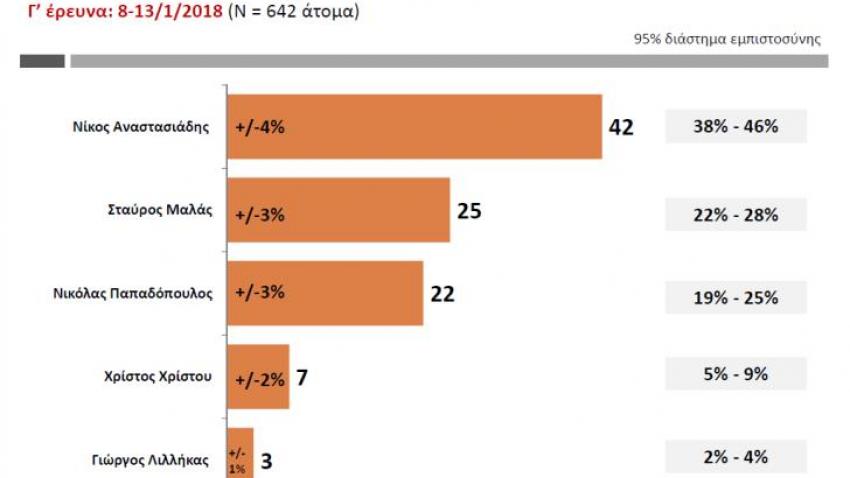 Δημοσκόπηση ΡΙΚ – Διευκρινισμένη ψήφος: Ο Νίκος Αναστασιάδης εξασφαλίζει ποσοστό 42% με απόκλιση συν/πλην 4%. Ο Σταύρος Μαλάς ποσοστό 25% και απόκλιση συν/πλην 3%. Ο Νικόλας Παπαδόπουλος 22% με απόκλιση συν/πλην 3%. Ο πρόεδρος του ΕΛΑΜ ποσοστό 7% με απόκλιση συν/πλην 2% και ο Γιώργος Λιλλήκας ποσοστό 3% με απόκλιση 1%.