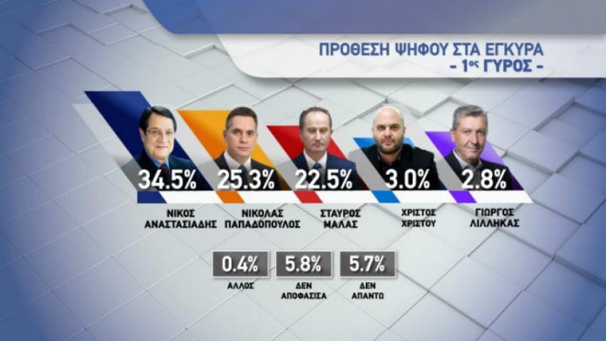 Επί των εγκύρων ο Νίκος Αναστασιάδης συγκεντρώνει 34,5%, ο Νικόλας Παπαδόπουλος 25,3%, ο Σταύρος Μαλάς 22,5%, ο Χρίστος Χρίστου 3% και ο Γιώργος Λιλλήκας 2,8%.