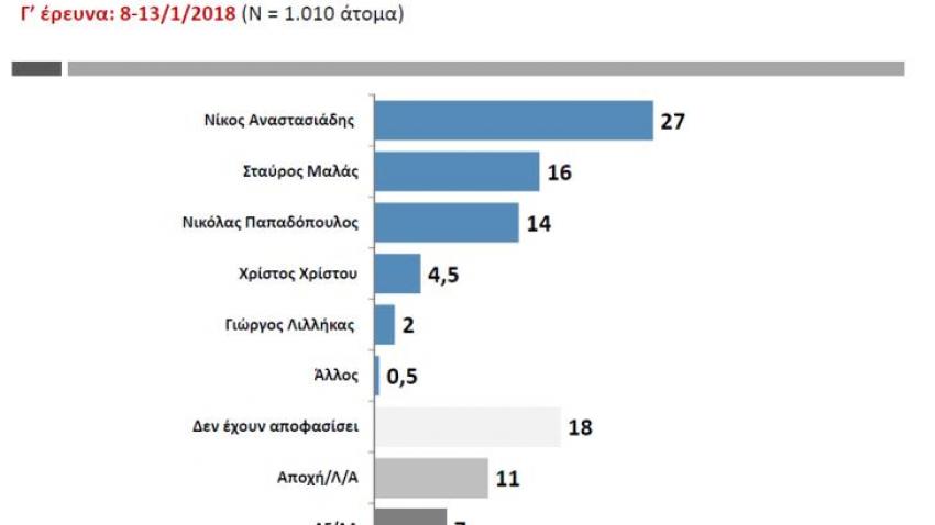 Δημοσκόπηση ΡΙΚ – Aδιευκρίνιστη ψήφος: Νίκος Αναστασιάδης 27%, Σταύρος Μαλάς εξασφαλίζει 16%, Νικόλας Παπαδόπουλος 14%, Χρίστος Χρίστου 4,5% και Γιώργος Λιλλήκας 2%. Οι άλλοι υποψήφιοι συγκεντρώνουν 0,5%. Το ποσοστό όσων δεν έχουν αποφασίσει ανέρχεται στο 18% και η αποχή στο 11%. Ποσοστό 7% δηλώνει ότι δεν απαντά.