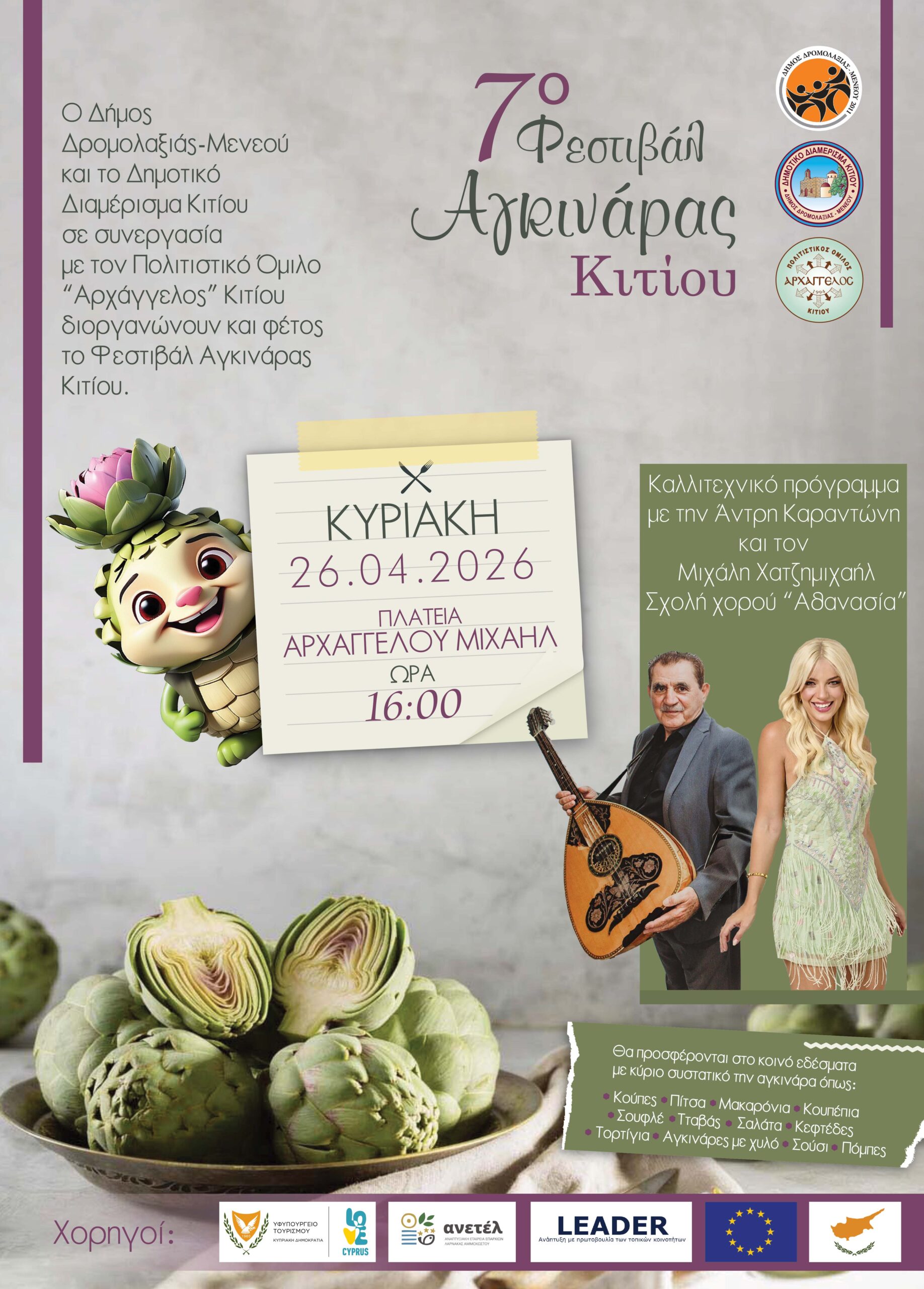 Ο Δήμος Δρομολαξιάς–Μενεού και το Δημοτικό Διαμέρισμα Κιτίου, σε συνεργασία με τον Πολιτιστικό Όμιλο «Αρχάγγελος» Κιτίου, διοργανώνουν το 7ο Φεστιβάλ Αγκινάρας, το οποίο θα πραγματοποιηθεί την Κυριακή, 26 Απριλίου 2026, από τις 16:00 μέχρι αργά το βράδυ, στην Πλατεία Αρχαγγέλου Μιχαήλ στο Κίτι.