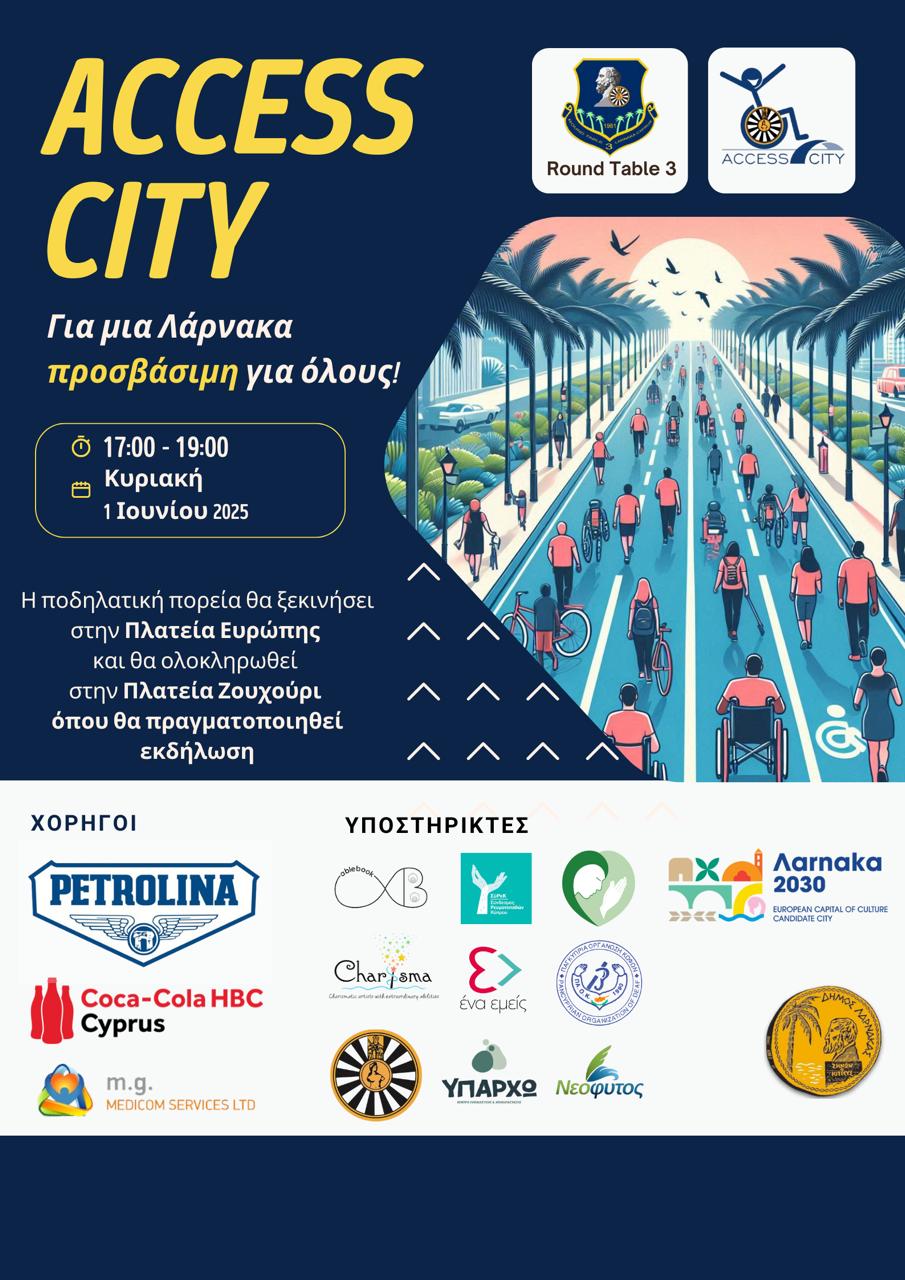 Η Λάρνακα υποδέχεται για τρίτη συνεχόμενη χρονιά την εκδήλωση Access City, η οποία θα πραγματοποιηθεί το Κυριακή 1η Ιουνίου 2025 και ώρα 17:00, με σημείο εκκίνησης την Πλατεία Ευρώπης στη Λεωφόρο Αθηνών.