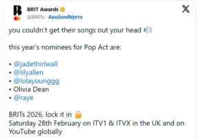 Η Olivia Dean και η Lola Young επιβεβαιώνουν τη δυναμική τους παρουσία στη βρετανική ποπ σκηνή, ξεχωρίζοντας στις υποψηφιότητες των φετινών μουσικών βραβείων της Βρετανικής Φωνογραφικής Βιομηχανίας – Brit Awards 2026.