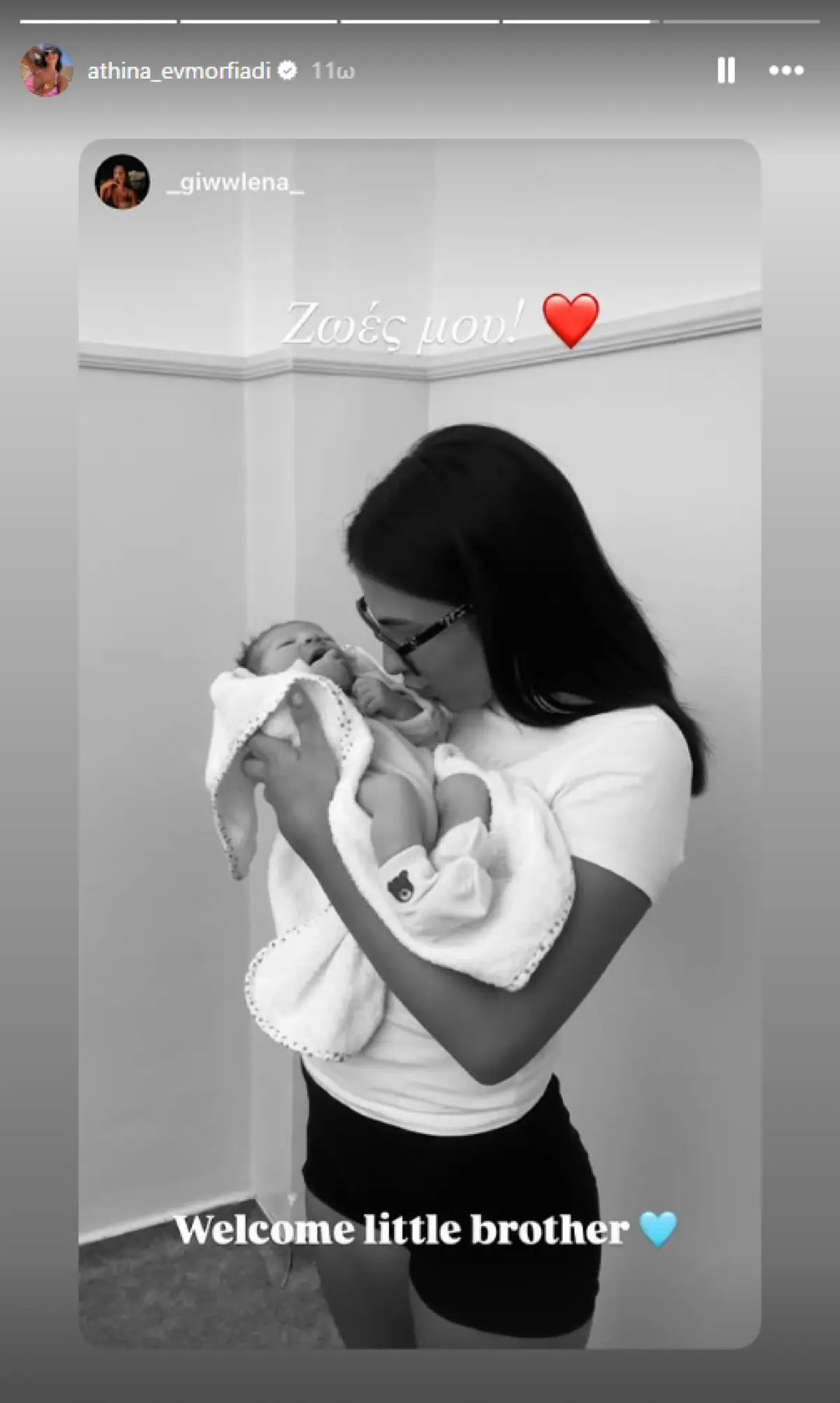Μια γλυκιά ανάρτηση έκανε και η μεγαλύτερη κόρη της Αθηνάς, κρατώντας στην αγκαλιά της τον μικρό της αδερφό και γράφοντας: «Καλώς ήρθες, μικρέ αδερφέ», με τη μητέρα να σχολιάζει: «Ζωές μου!».