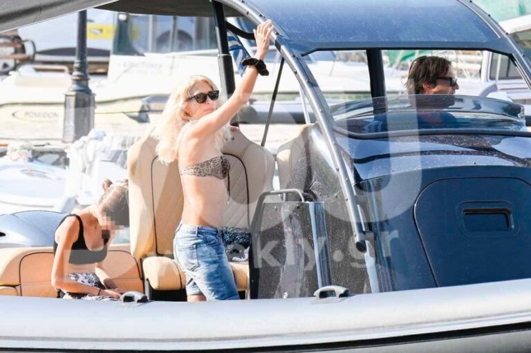 Η κάμερα της εκπομπής «Καλοκαιρινό Ραντεβού» εντόπισε την Ελένη Μενεγάκη, ενώ βρισκόταν πάνω σε φουσκωτό μαζί με τον επιχειρηματία, φορώντας ένα γαλάζιο μπικίνι και γυαλιά ηλίου.