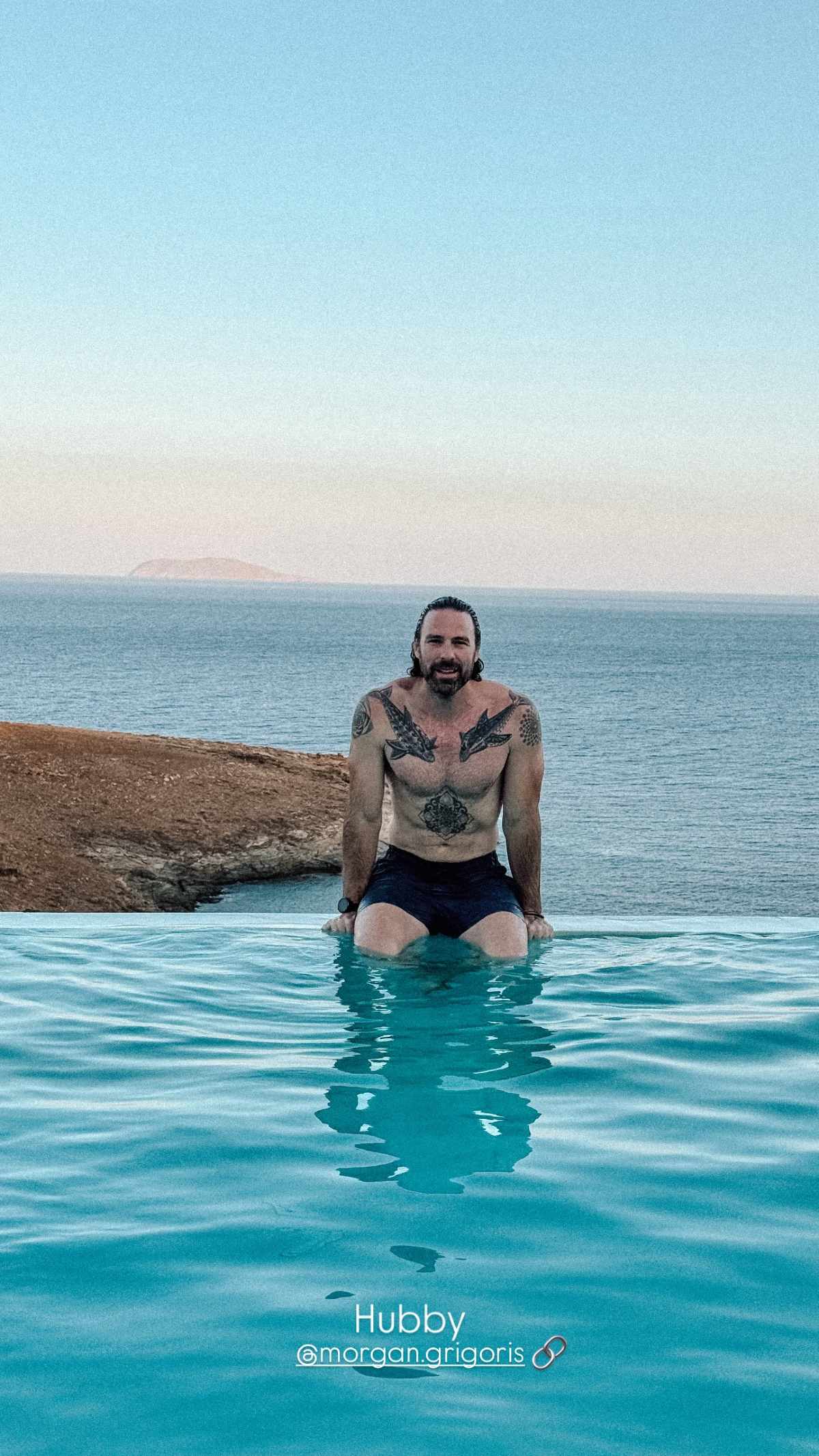 Τα στιγμιότυπα από την παραλία Επισκοπή, η θάλασσα στο βάθος, η πισίνα του ξενοδοχείου και, φυσικά, ο μικρός τους πρίγκιπας στο καροτσάκι του, συνθέτουν ένα τρυφερό καλοκαιρινό άλμπουμ.