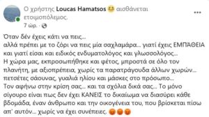 Ο Λουκάς Χάματσος, με ανάρτησή του στο Facebook, δήλωσε δημόσια τη δυσαρέσκειά του για το σχόλιο που έγινε στην εκπομπή σχετικά με την πρόσφατη τηλεοπτική του παρουσία, κάνοντας λόγο για προσωπική στοχοποίηση που επηρεάζει ακόμη και την οικογένειά του.