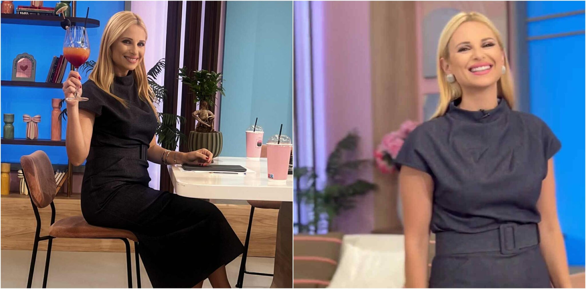 Η αγαπημένη μας παρουσιάστρια, τράβηξε όλα τα βλέμματα με το two pieces denim σύνολο της και σε συνδιασμό με τις ρος τις γόβες, θύμιζε γυναίκα από τα sixties. Το midi σύνολο αγκάλιαζε υπέροχα το σώμα της παρουσίαστριας, ενώ από την άλλη οι ροζ γόβες έκαναν την διαφορά αφού χάριζαν στην παρουσιάστρια ένα αέρα αυτοπεποίθησης και σιγουριάς.