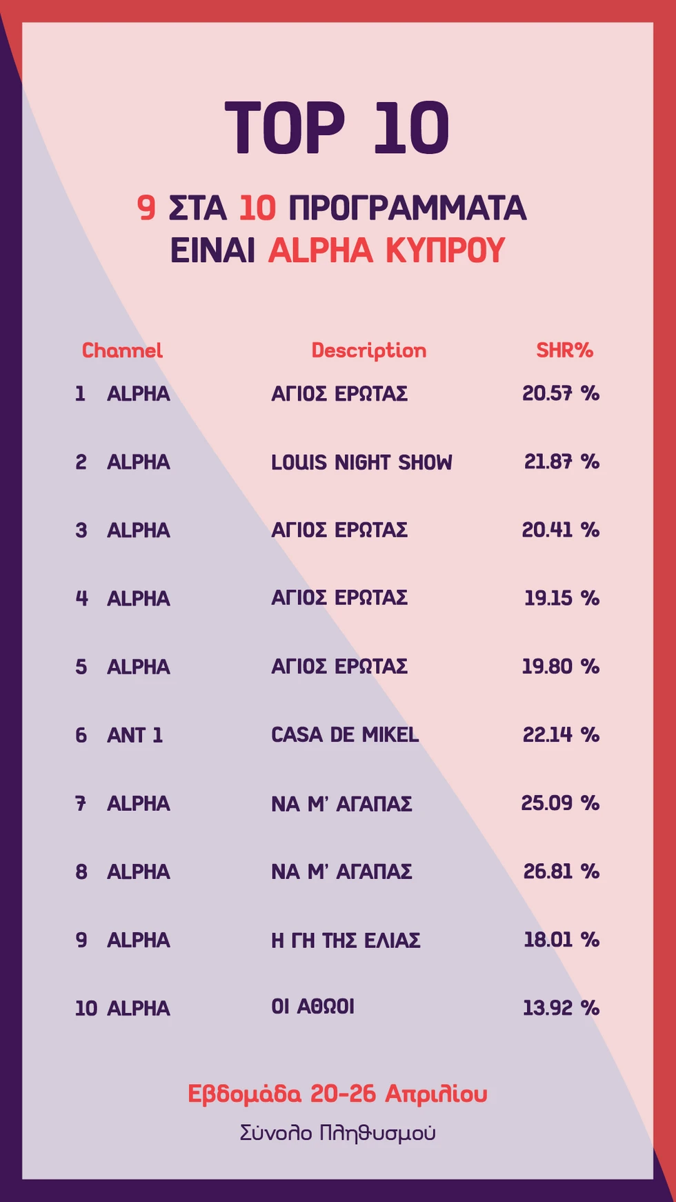 Η επιτυχία της prime time ζώνης και της μυθοπλασίας διαφαίνεται και στα κορυφαία προγράμματα της εβδομάδας. Για την προηγούμενη εβδομάδα, το top 10 της κυπριακής τηλεόρασης κατακτήθηκε από τον Alpha Κύπρου, αφού και τα 9 πιο επιτυχημένα προγράμματα ανήκουν στο κανάλι.