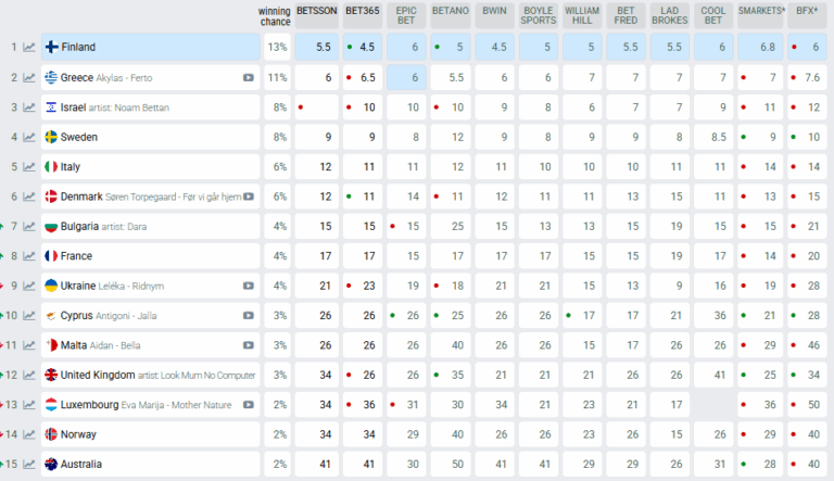 Στον συγκεντρωτικό πίνακα των στοιχηματικών εταιρειών, η Ελλάδα προσπέρασε το Ισραήλ, το οποίο παραμένει ψηλά παρά το γεγονός ότι δεν έχει κυκλοφορήσει ακόμη το τραγούδι του.