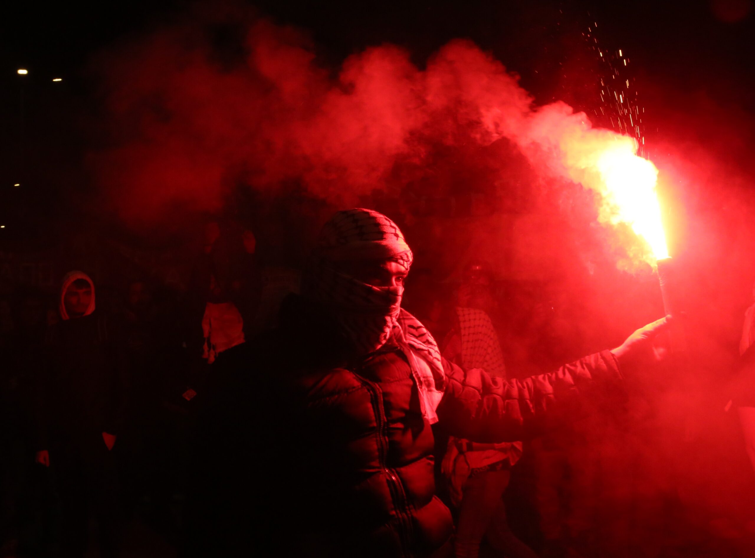 Η πορεία ξεκίνησε από το πάρκο Ελευθερίας και κατευθυνόταν προς την πρεσβεία του Ισραήλ με συνθήματα υπέρ της Παλαιστίνης.