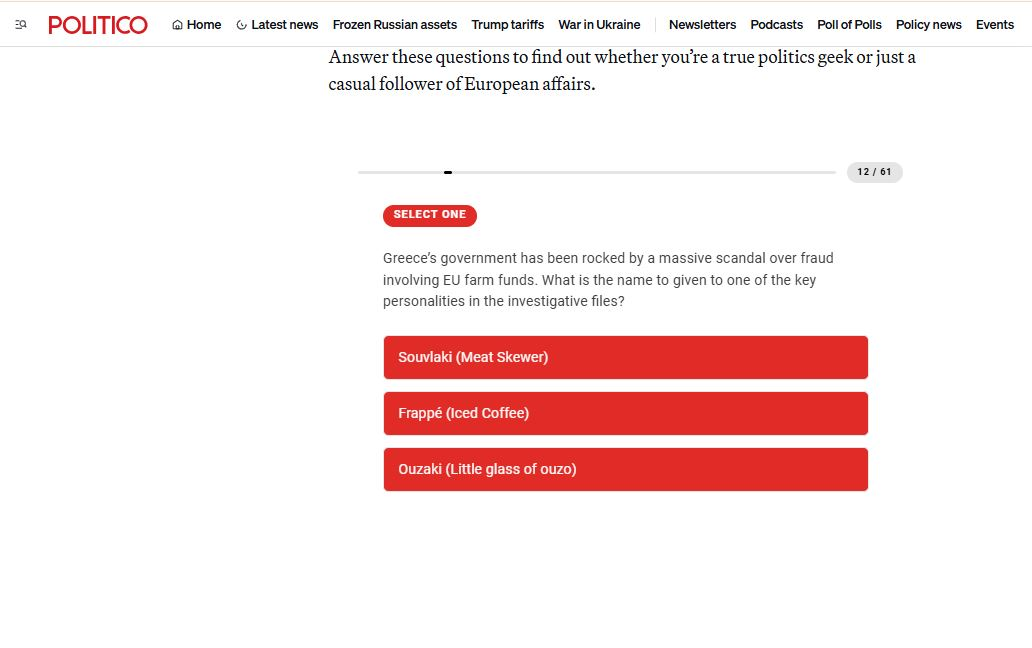 Στο κεντρικό της θέμα η ιστοσελίδα έχει ένα μεγάλο κουίζ για τους αναγνώστες της, οι οποίοι τεστάρουν τις γνώσεις (και την μνήμη τους) για γεγονότα που συνέβησαν το 2025 ή για παραπολιτικές λεπτομέρειές τους. «Απάντησε σε αυτές τις ερωτήσεις για να ανακαλύψεις αν είσαι πραγματικός φανατικός της πολιτικής ή απλώς ένας περιστασιακός παρατηρητής των ευρωπαϊκών εξελίξεων», γράφει το Politico, θέτοντας ερωτήματα για τα ευρωπαϊκά όργανα, τα κράτη-μέλη και τις ΗΠΑ.