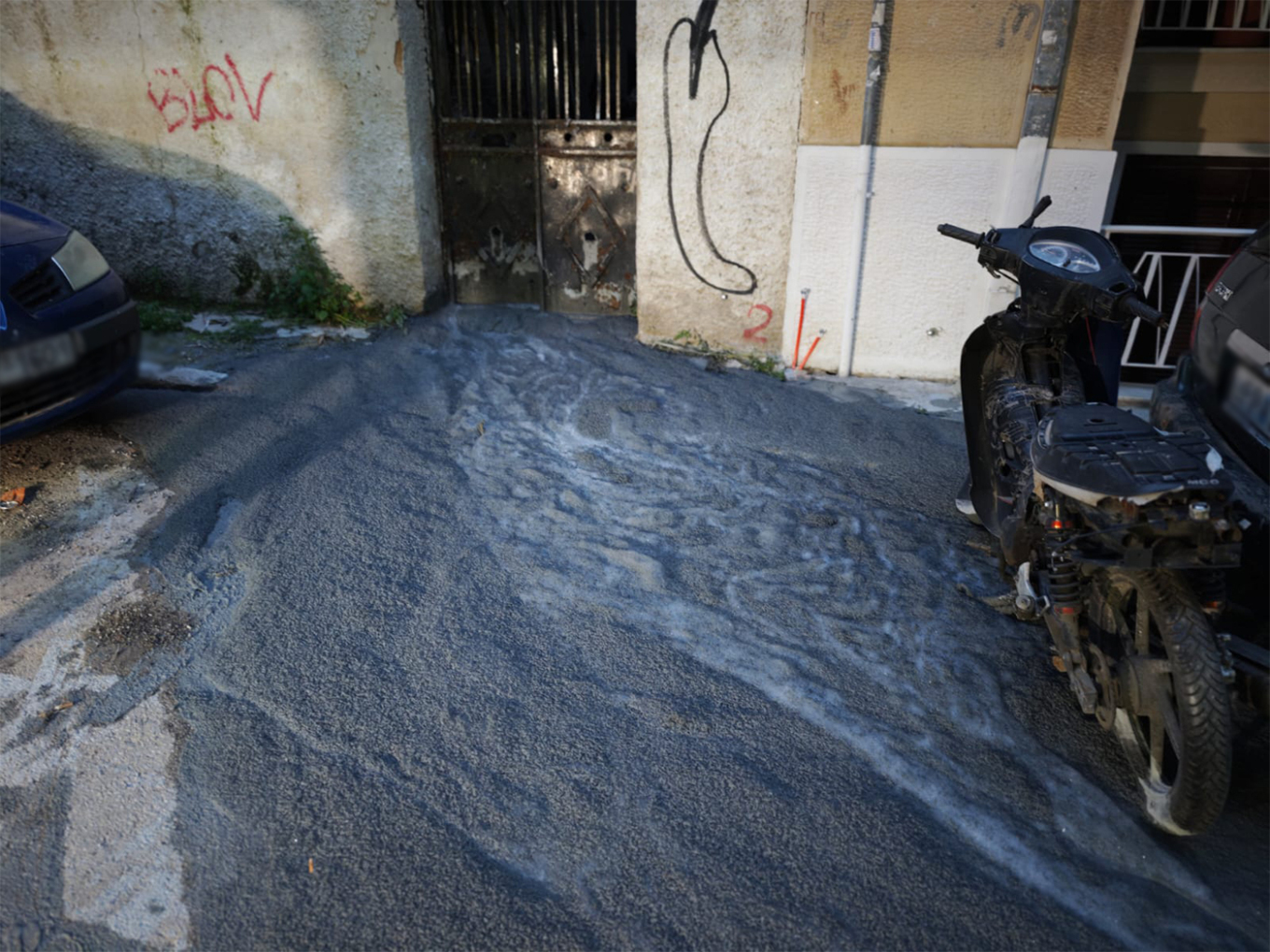 Λίγο μετά τις 4 το απόγευμα της Τετάρτης ένας κάτοικος της περιοχής είδε να βγαίνει από την αυλόπορτα του οικοπέδου επί της οδού Στροφάδων ένα γκρι, πηχτό υγρό και άνοιξε για να δει τι συμβαίνει.