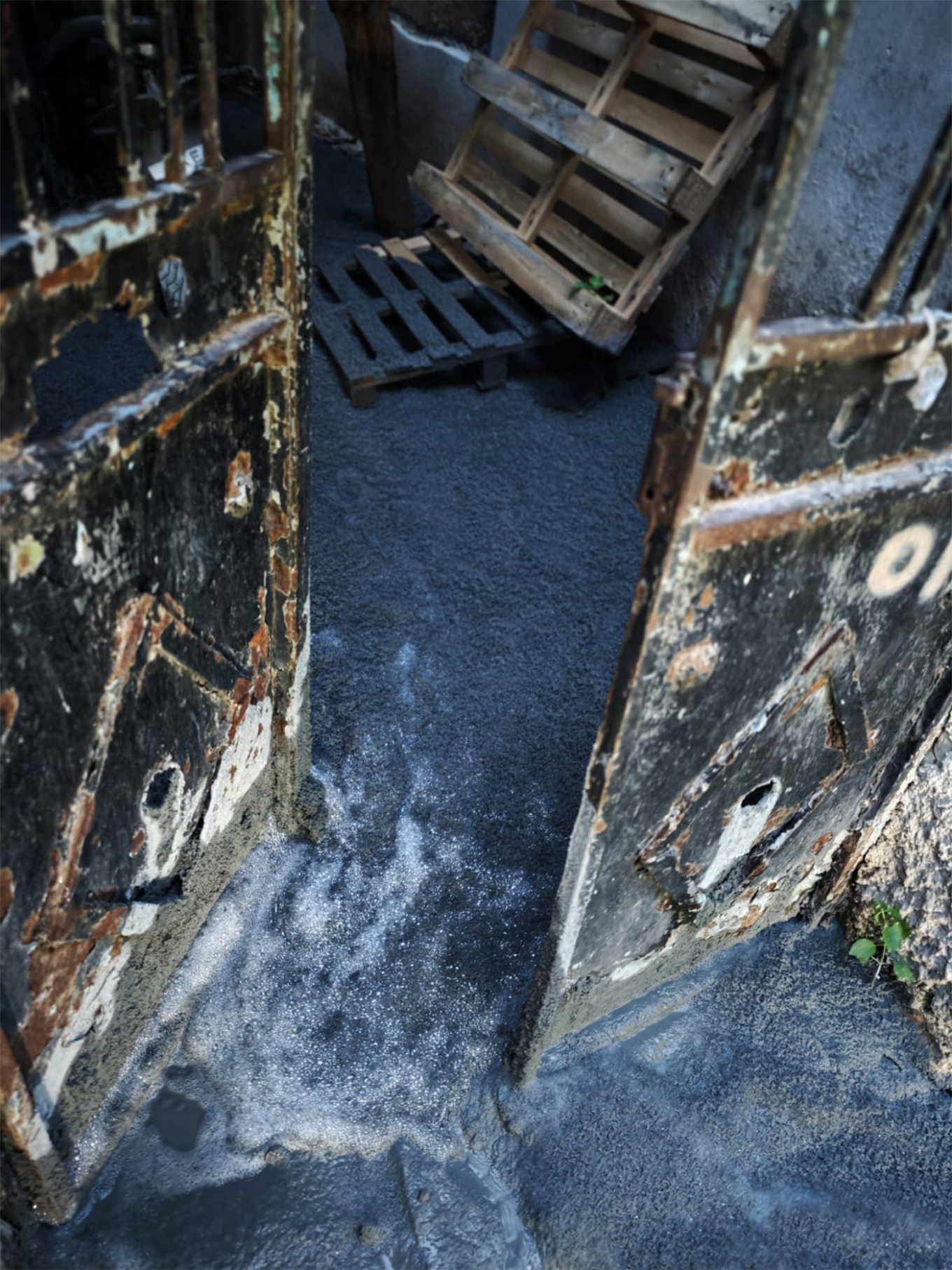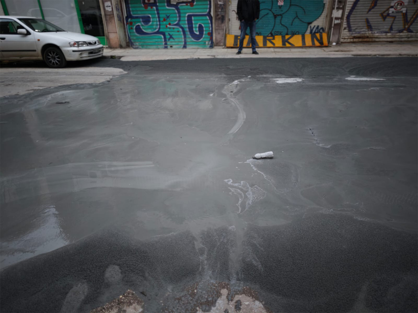 Μόλις μπήκε στην αυλή αντίκρισε το υγρό να αναβλύζει από το έδαφος και να έχει καλύψει το κράσπεδο. Η διαρροή δεν σταμάτησε καθ’ όλη τη διάρκεια της νύχτας με αποτέλεσμα το γκρι υγρό να έχει καλύψει το οδόστρωμα σε όλο το οικοδομικό τετράγωνο.