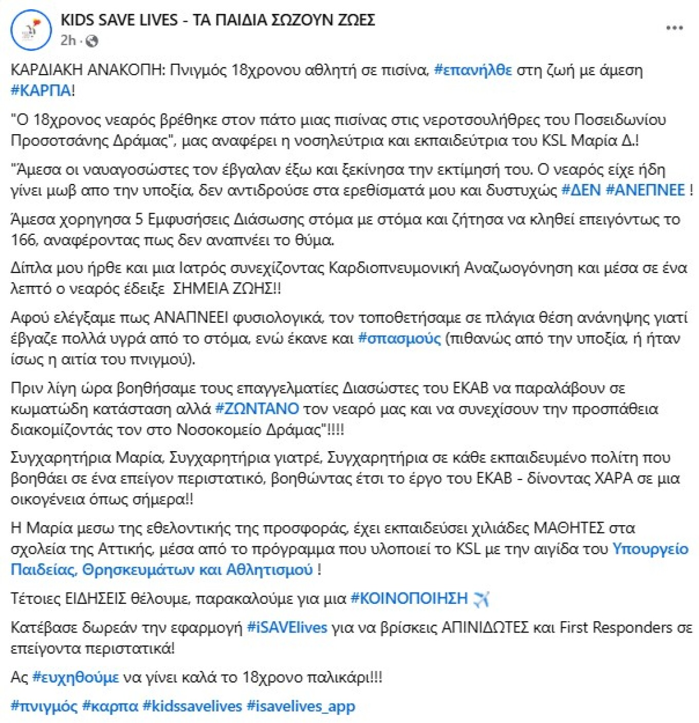 Τις αγωνιώδεις προσπάθειες διάσωσης μετέφερε μέσω της ανάρτησης η εκπαιδεύτρια του «Kids Save Lives», Μαρία Δρίτσα, αφότου ο 18χρονος βρέθηκε στον βυθό της πισίνας.