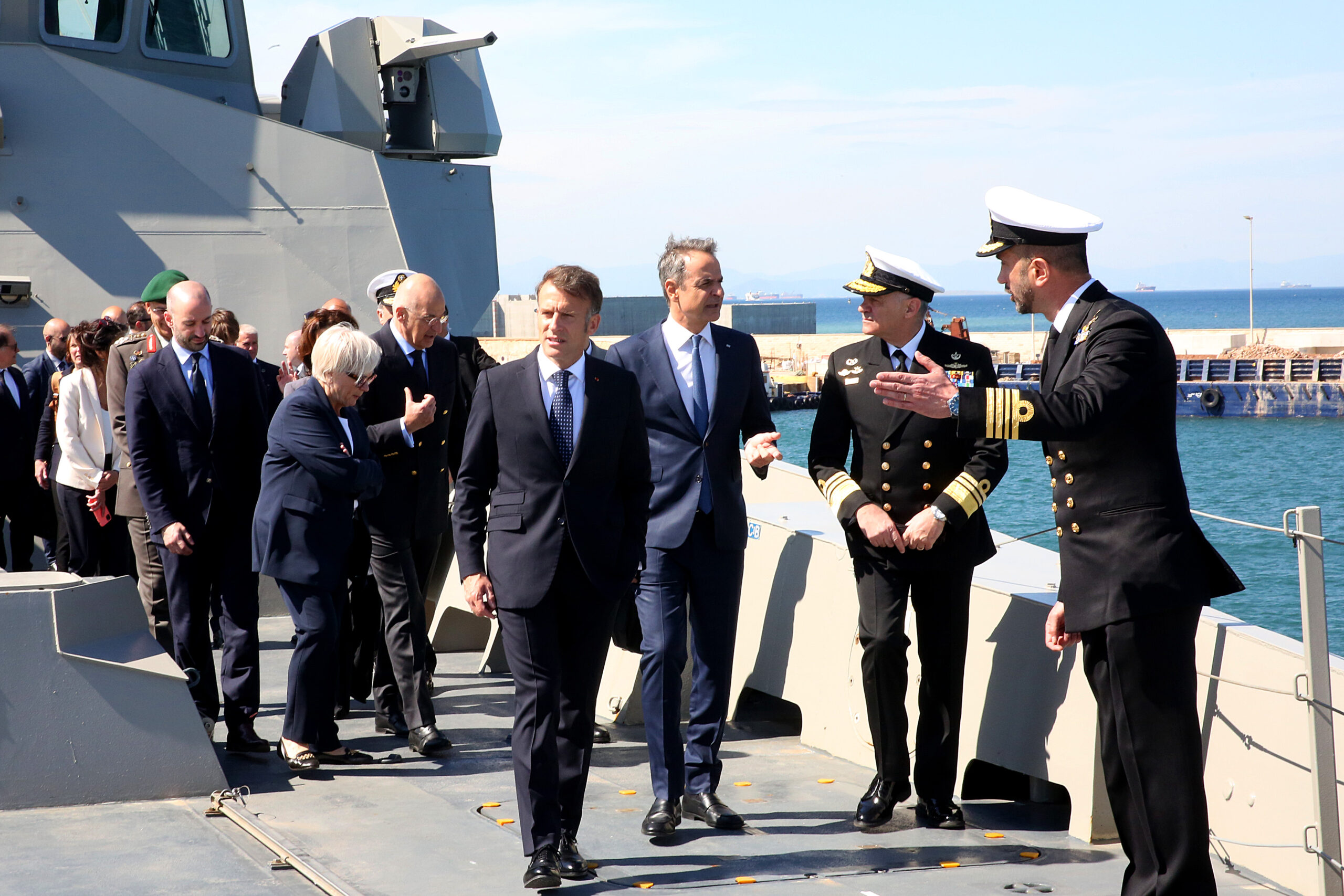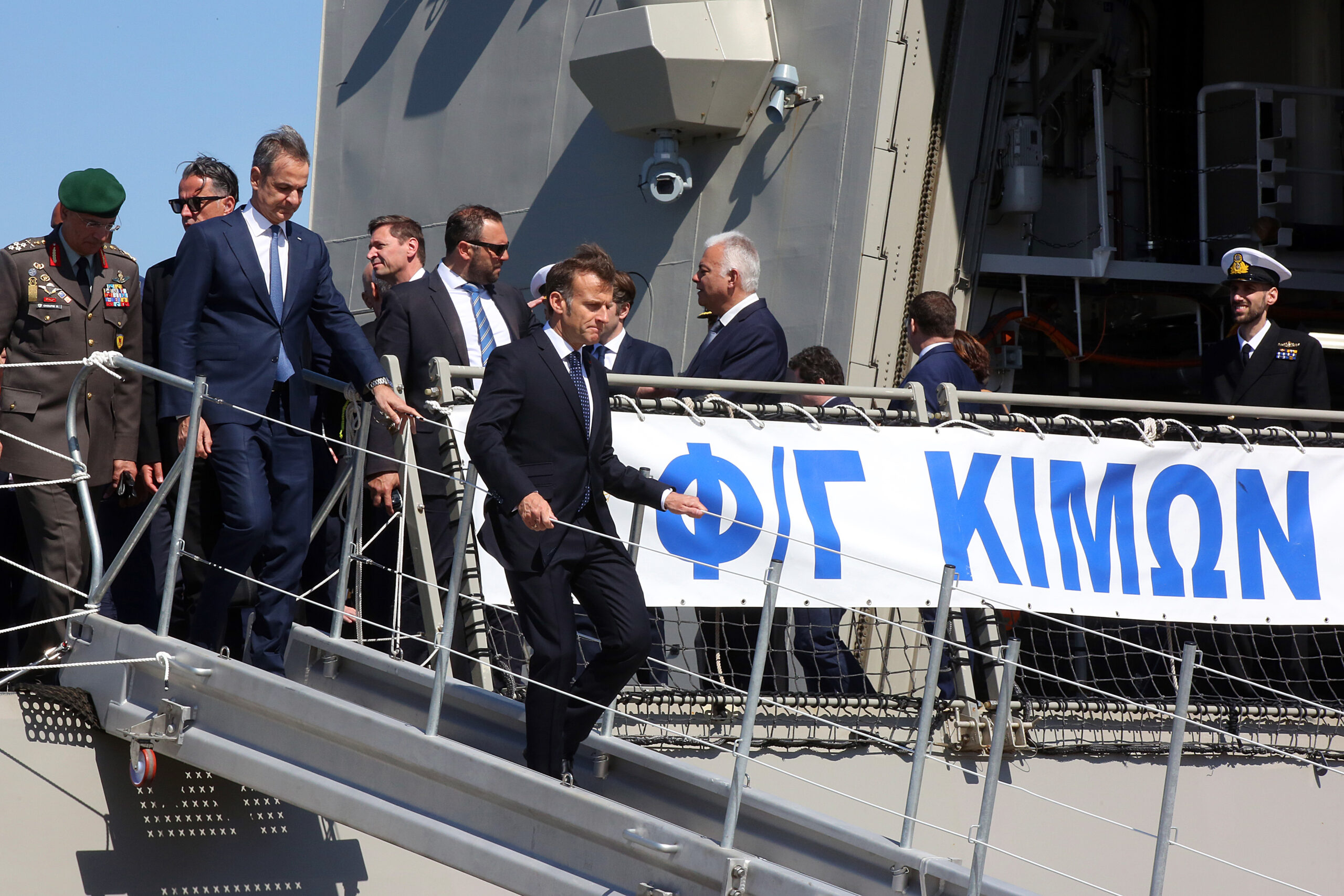 Το πρωί ο πρωθυπουργός και ο Πρόεδρος της Γαλλίας επισκέφθηκαν και ξεναγήθηκαν στη φρεγάτα «Κίμων» στο λιμάνι του Πειραιά.