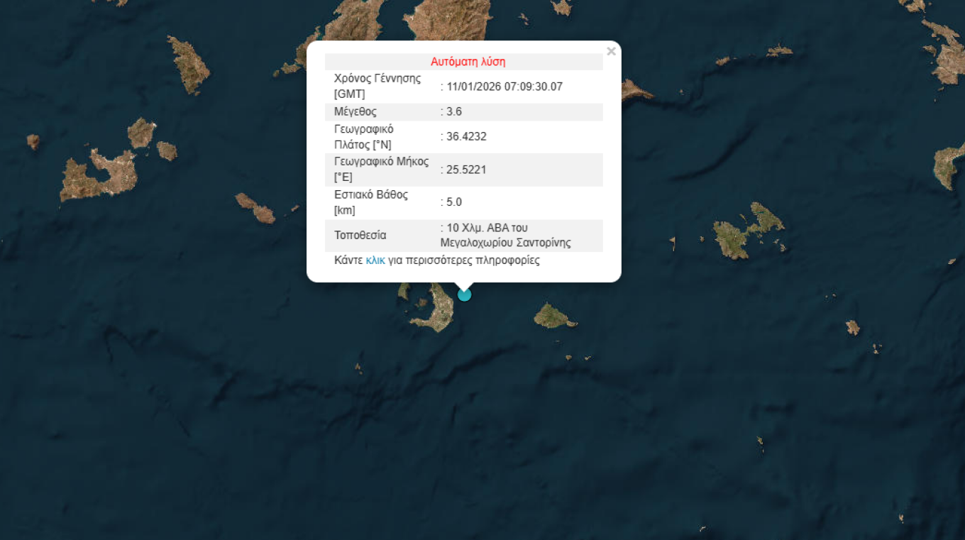 Σεισμός 3,6 Ρίχτερ σημειώθηκε πριν από λίγο στα ανοιχτά της Σαντορίνης, 10 χιλιόμετρα ανατολικά-βορειοανατολικά του Μεγαλοχωρίου.