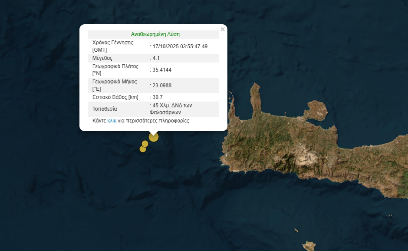 Σεισμός μεγέθους 4,1 βαθμών της κλίμακας Ρίχτερ σημειώθηκε νωρίς το πρωί της Παρασκευής στη θαλάσσια περιοχή στα Φαλάσαρνα Κρήτης, πολύ κοντά στο νησί.