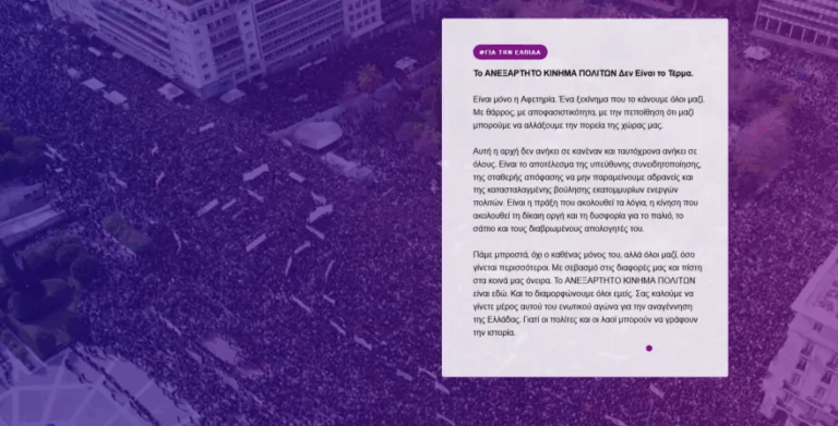 «Είμαστε ένα ΑΝΕΞΑΡΤΗΤΟ ΚΙΝΗΜΑ ΠΟΛΙΤΩΝ που γεννιέται από τη βάση, από την κοινή μας ανάγκη να έρθει επιτέλους η αλλαγή. Όλοι εμείς Είμαστε άνθρωποι με διαφορετικές καταβολές, με ποικίλες διαδρομές, κινηματικές ή όχι, κάθε ηλικίας και εμπειρίας. Δεν μας χωράει μια ταμπέλα. Μας ενώνει ένα κοινό όραμα: ότι ΑΞΙΖΟΥΜΕ ΜΙΑ ΚΑΛΥΤΕΡΗ ΧΩΡΑ. Και μια κοινή ανάγκη: ΝA ΑΝΤΙΜΕΤΩΠΙΣΟΥΜΕ ΤΙΣ ΥΠΑΡΞΙΑΚΕΣ ΑΠΕΙΛΕΣ για την κοινωνία και την πατρίδα μας. Κουβαλάμε μέσα μας ιστορίες διαφορετικές, αλλά κοινά όνειρα και μεγάλη δυσπιστία σε όσους οδήγησαν τη χώρα στα σημερινά πολλαπλά αδιέξοδα. Είμαστε γυναίκες και άνδρες, χωρίς διαχωρισμούς και διακρίσεις, σπουδαστές, φοιτητές, άνεργοι ή εργαζόμενοι, στη γη, σε εργοστάσιο, εργαστήριο, σκηνή ή γραφείο, υπάλληλοι, επαγγελματίες και επιχειρηματίες, επιστήμονες και καλλιτέχνες, νέοι και μεγαλύτεροι σε ηλικία, που ονειρεύονται και δημιουργούν καθημερινά ένα καλύτερο ΚΟΙΝΟ ΑΥΡΙΟ. Είμαστε άνθρωποι που βλέπουμε την αδικία και δεν γυρίζουμε το κεφάλι αλλού, που αισθανόμαστε καλύτερα δείχνοντας αλληλεγγύη στον συνάνθρωπο, κάθε φορά, που κάποιος σκοντάφτει ή δυσκολεύεται να ακολουθήσει».