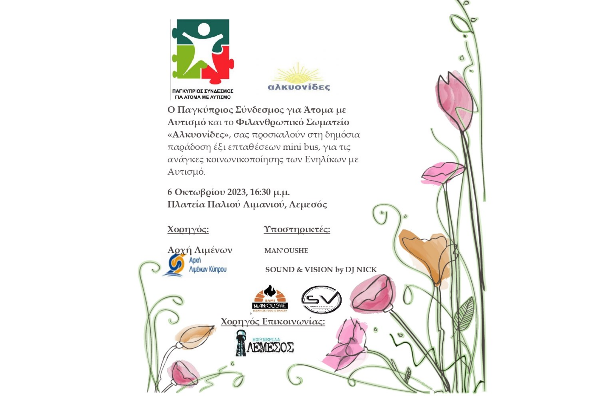 Καλούμε το κοινό να παραστεί σε αυτή τη δημόσια τελετή παράδοσης των έξι οχημάτων, στις 6 Οκτωβρίου 2023, ώρα 16:30 μ.μ. στην Πλατεία Παλαιού Λιμανιού Λεμεσού θα γίνει η παράδοση των έξι επταθέσεων mini bus από το φιλανθρωπικό Σωματείο «Αλκυονίδες» στον Παγκύπριο Σύνδεσμο για Άτομα με Αυτισμό.