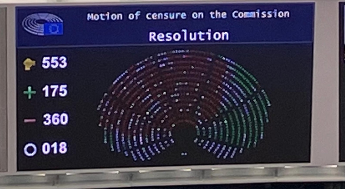 Κατά τη διάρκεια της Ολομέλειας του Ευρωπαϊκού Κοινοβουλίου στο Στρασβούργο, οι ευρωβουλευτές με ψήφους 175 υπέρ, 360 κατά και 18 αποχές απέρριψαν την πρόταση μομφής, η οποία εάν περνούσε δεν θα οδηγούσε μόνο στην παραίτηση της προέδρου αλλά σύσσωμης της Ευρωπαϊκής Επιτροπής. Δεδομένου ότι η πρόταση μομφής χρειάζεται πλειοψηφία δύο τρίτων για να εγκριθεί, ήταν βέβαιο ότι θα απορριφθεί.