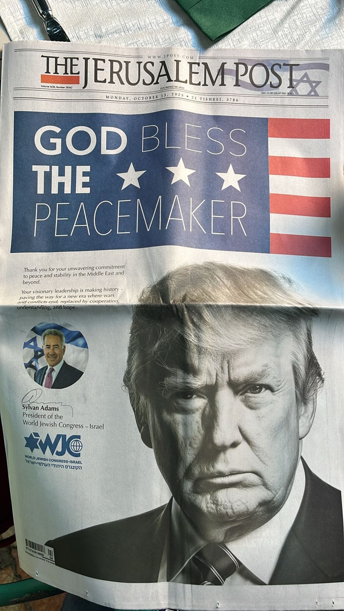 Xαρακτηριστικό του κλίματος για τον Τραμπ στο Ισραήλ και το πρωτοσέλιδο της Jerusalem Post στο οποίο αναφέρεται «god bless the peacemaker» (μτφ. Ο Θεός να έχει καλά τον ειρηνοποιό)