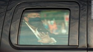 Προς γενική έκπληξη, μια οχηματοπομπή αποτελούμενη από μαύρα SUV εμφανίστηκε μπροστά στις πύλες του νοσοκομείου Ουόλτερ Ριντ νωρίς το βράδυ, κι ο Ντόναλντ Τραμπ, με μάσκα, χαιρέτισε μέσα από το κλειστό παράθυρο του αυτοκινήτου της προεδρίας πολυάριθμους υποστηρικτές του, που είχαν εγκατασταθεί στον χώρο έξω από το νοσοκομείο το Σαββατοκύριακο.