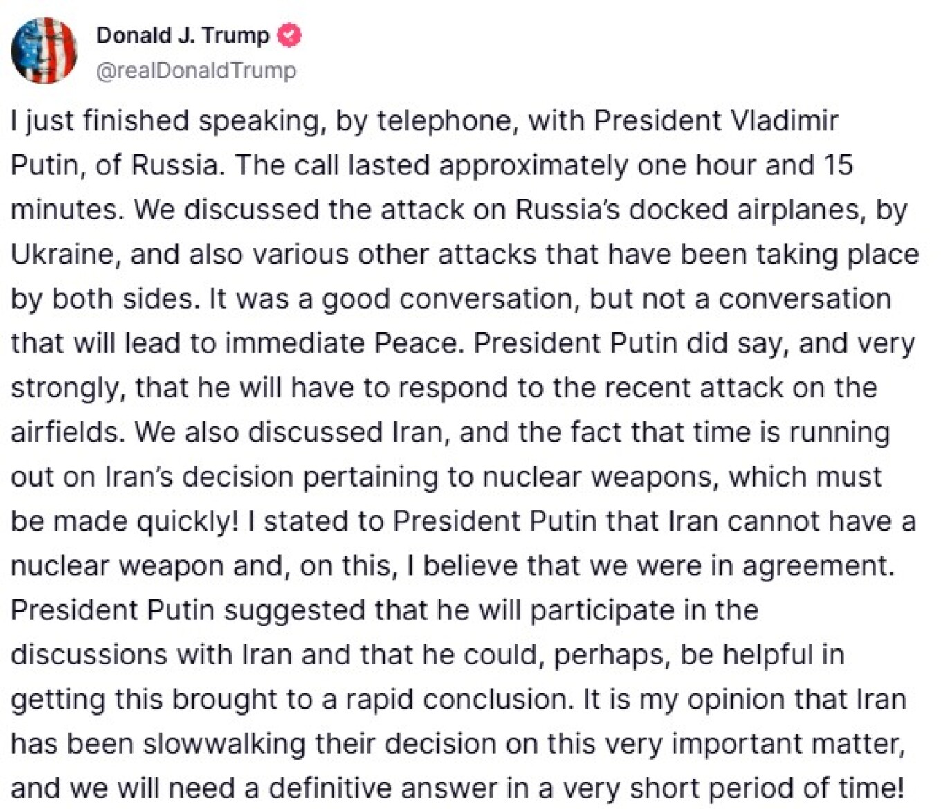 Σε ανάρτησή του, ο πρόεδρος των ΗΠΑ Ντόναλντ Τραμπ αποκάλυψε ότι είχε τηλεφωνική συνομιλία με τον Ρώσο ομόλογό του Βλαντίμιρ Πούτιν, διάρκειας περίπου μίας ώρας και δεκαπέντε λεπτών.