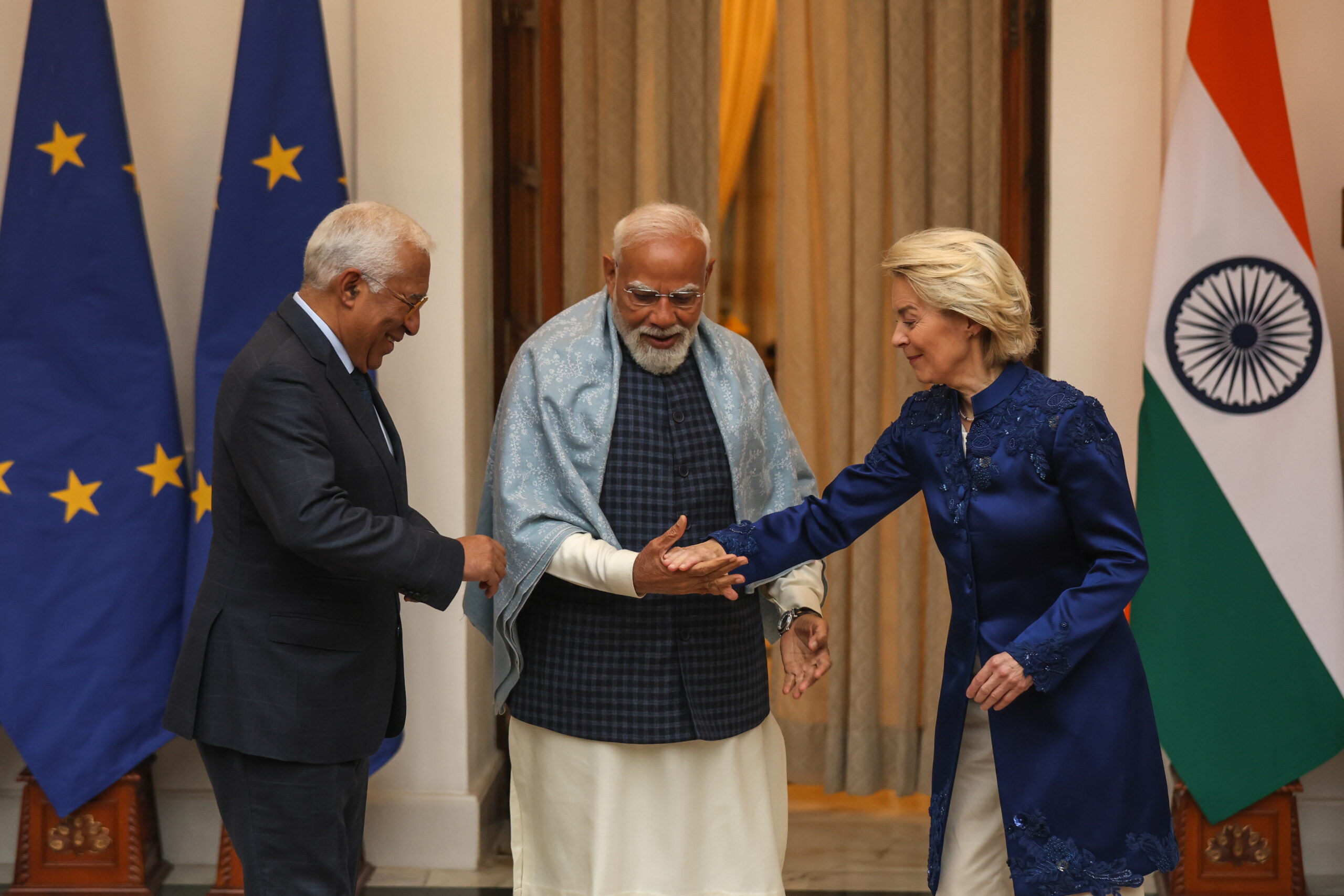 «Η Ινδία και η Ευρώπη έκαναν μια ξεκάθαρη επιλογή. Αυτή της στρατηγικής σύμπραξης, του διαλόγου και του ανοίγματος», υπογράμμισε στο X η φον ντερ Λάιεν, «δείχνουμε σ’ ένα κατακερματισμένο κόσμο πως ένας άλλος δρόμος είναι δυνατός».