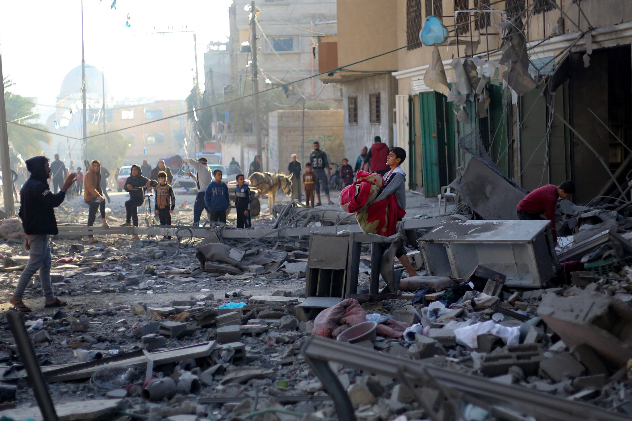 Την ίδια ώρα αυξάνονται και πληθύνονται οι εκτοπισμένοι Παλαιστίνιοι στον αυτοσχέδιο καταυλισμό που έχει στηθεί σε ασφαλή ζώνη κατά μήκος της ακτής της Γάζας. Οι συνθήκες διαβίωσης τους άθλιες και η καθημερινότητα τους ακόμα πιο βασανιστική. Ανάβουν φωτιά για να ζεσταθούν από το τσουχτερό κρύο.
