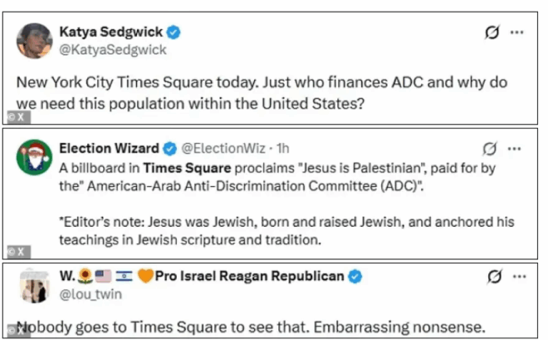 Αρκετές αντιδράσεις προκάλεσε στη Νέα Υόρκη διαφημιστική πινακίδα με το μήνυμα «ο Ιησούς είναι Παλαιστίνιος» που αναρτήθηκε στην Times Square από την οργάνωση American Arab Discrimination Committee.