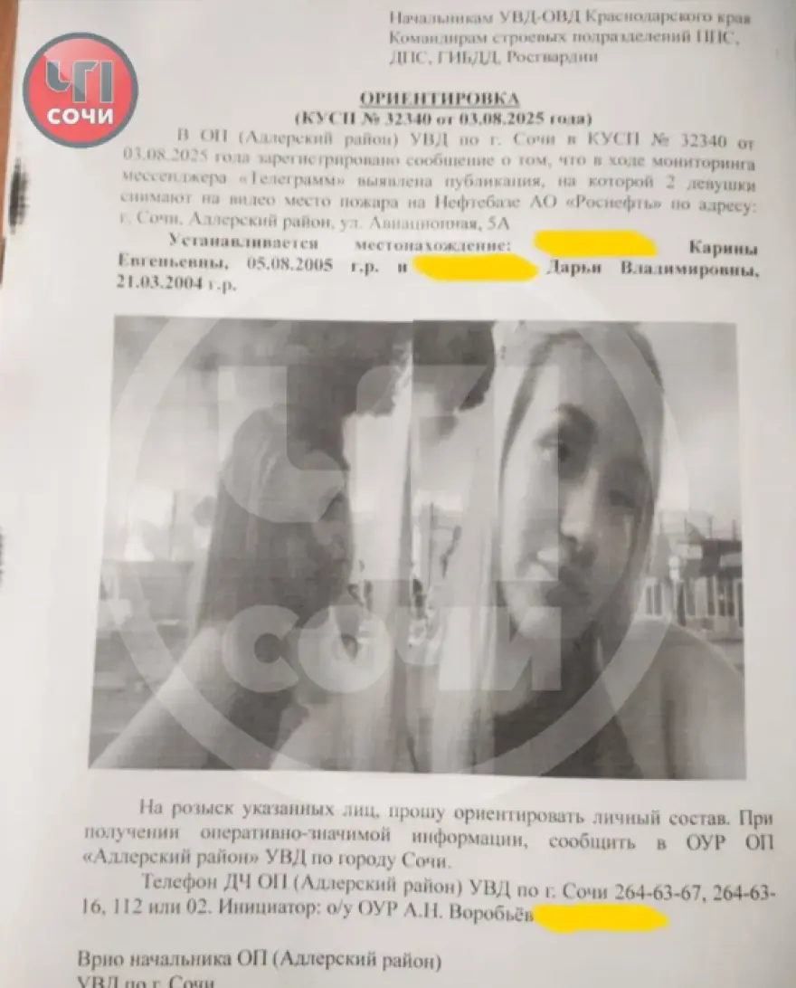 Two women, identified as 21-year-old Darya and 19-year-old Karina, alongside an unidentified male, have been arrested after filming a social media video earlier today in front of a burning oil depot in Adler, Southwestern Russia, which was targeted last night in a large-scale… pic.twitter.com/R8xr0xyqdu