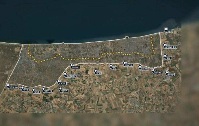 Η διακεκομμένη κίτρινη γραμμή είναι η γραμμή της πρώτης απόσυρσης των ισραηλινών στρατευμάτων (πηγή: Γραφείο Τύπου του IDF)