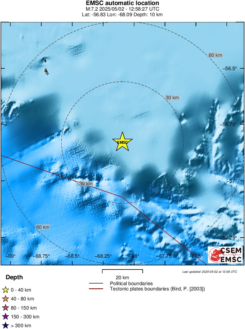 Μια σεισμική μεγέθους 7,4 βαθμών έπληξε σήμερα το Πέρασμα Ντρέικ, τη θαλάσσια περιοχή ανάμεσα στο ακρωτήριο Χορν και την Ανταρκτική, ωθώντας τις χιλιανές αρχές και τις αρχές της Αργεντινή να εκδώσουν εντολή εκκένωσης περιοχών στο νότιο άκρο της χώρας, μετά την προειδοποίηση για τσουνάμι.