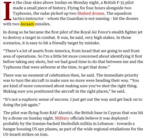 Ένα μικρό «κομμάτι» ιστορίας έγραψε Βρετανός πιλότος μαχητικού αεροσκάφους τύπου F-35, ο οποίος μίλησε στην ηλεκτρονική έκδοση της εφημερίδας The Guardian για τα όσα βίωσε συμμετέχοντας σε στρατιωτική επιχείρηση αναχαίτισης ιρανικών πυρών, από τις Βρετανικές Βάσεις Ακρωτηρίου.