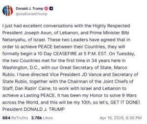 «Μόλις είχα εξαιρετικές συζητήσεις με τον σεβαστό Πρόεδρο του Λιβάνου, Joseph Aoun, και τον Πρωθυπουργό του Ισραήλ, Bibi Netanyahu. Αυτοί οι δύο ηγέτες συμφώνησαν ότι, προκειμένου να επιτευχθεί ΕΙΡΗΝΗ μεταξύ των χωρών τους, θα ξεκινήσουν επίσημα μια 10ήμερη ΚΑΤΑΠΑΥΣΗ ΤΟΥ ΠΥΡΟΣ στις 5 μ.μ. EST»