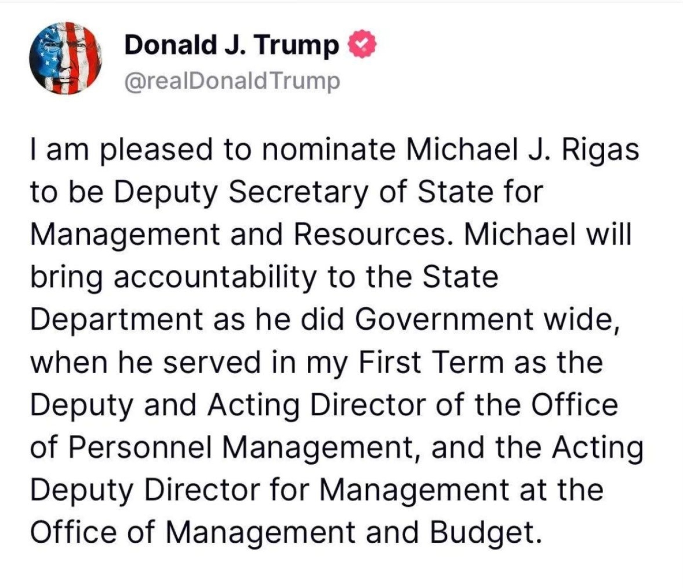 Να σημειωθεί ότι ο Μάικλ Ρήγας ήταν στο στενό περιβάλλον του Ντόναλντ Τραμπ και έχει διαδραματίσει σημαντικό ρόλο στο Project 2025, μια πρωτοβουλία που συντονίζεται από το συντηρητικό think tank The Heritage Foundation.