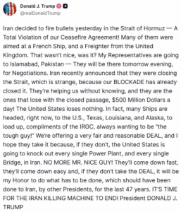 Σε μια εκτενή ανάρτηση που δημοσίευσε στην πλατφόρμα του Truth Social, ο πρόεδρος των ΗΠΑ κατηγόρησε το Ιράν «παραβίαση της συμφωνίας κατάπαυσης του πυρός» μετά την «απόφασή του να ρίξει πυροβολισμούς χθες στο Στενό του Ορμούζ».