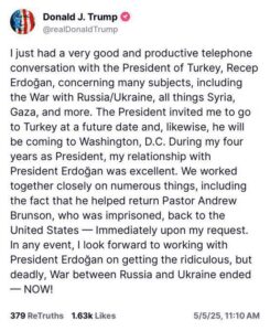 Σημαντική βελτίωση του κλίματος μεταξύ Ουάσιγκτον και Άγκυρας σηματοδότησε με ανάρτησή του στα μέσα κοινωνικής δικτύωσης ο Πρόεδρος Ντόναλντ Τραμπ, επαινώντας τον Πρόεδρο της Τουρκίας, Ρετζέπ Ταγίπ Ερντογάν, για την «αγαστή συνεργασία» που είχε με εκείνον κατά την διάρκεια της πρώτης του θητείας στον Λευκό Οίκο. Συγκεκριμένα, ο Τραμπ αναφέρθηκε σε χθεσινή τηλεφωνική επικοινωνία που είχε με τον Ερντογάν, κατά την οποία ζήτησε την διαμεσολάβηση της Άγκυρας προκειμένου να λήξει το αδιέξοδο που έχει προκύψει στις τριγωνικές συνομιλίες Ουάσιγκτον-Μόσχας-Κιέβου για την διευθέτηση του Ουκρανικού. Παράλληλα, ο Αμερικανός Πρόεδρος ανέφερε ότι συζητήθηκε το ενδεχόμενο πραγματοποίησης κατ’ ιδίαν συνάντησής του με τον Τούρκο Πρόεδρο, είτε στον Λευκό Οίκο είτε στην Άγκυρα, ενώ ανέφερε ότι συζήτησε και την κατάσταση στη Συρία, στη Γάζα και στην Μέση Ανατολή γενικότερα.