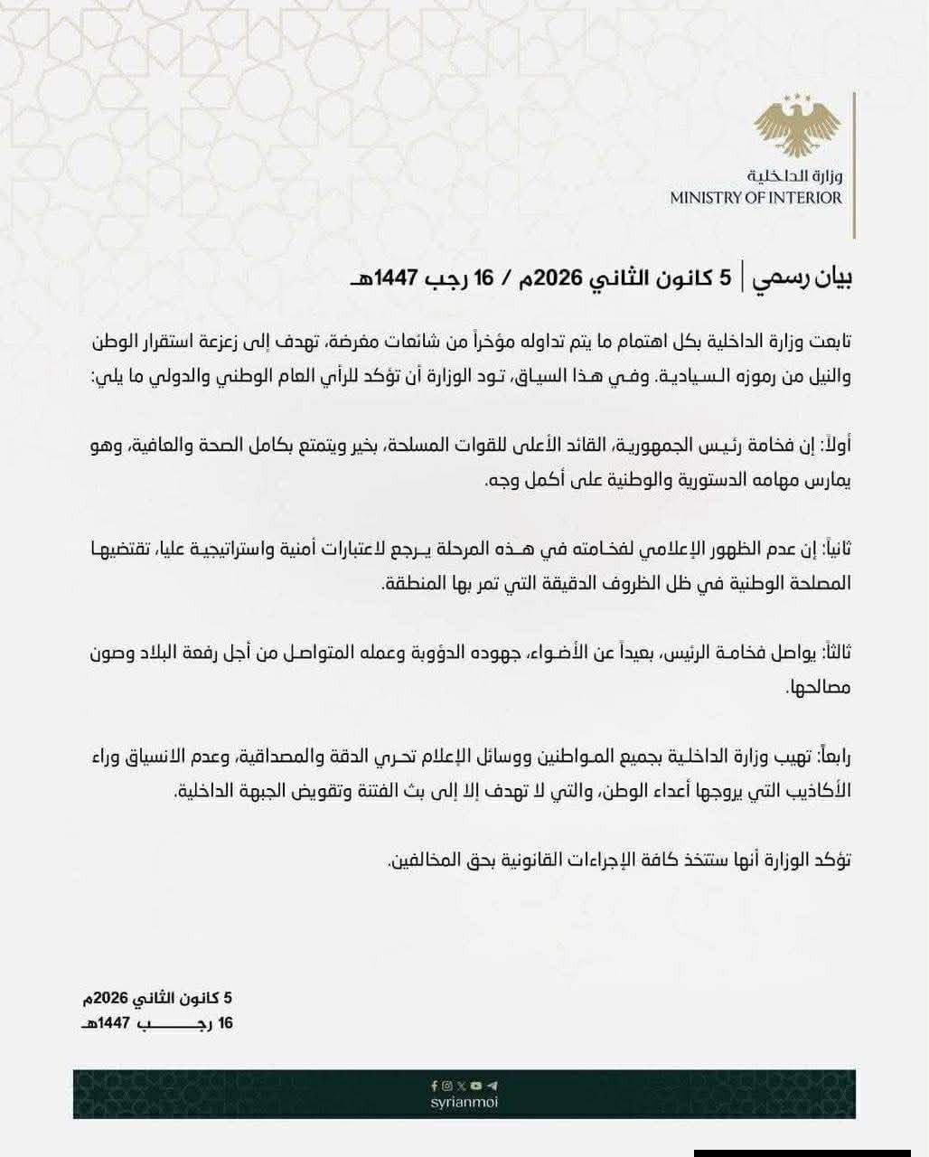 Η επίσημη ανακοίνωση του συριακού Υπουργείου Εσωτερικών που δημοσιεύθηκε στις 5/1/2026