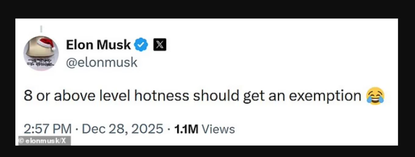 Την ανάρτηση είδε ο Έλον Μασκ και σχολίασε «οι σέξι γυναίκες με βαθμολογία 8 ή παραπάνω θα πρέπει να εξαιρούνται» βάζοντας και ένα emoji που κλαίει και γελάει.