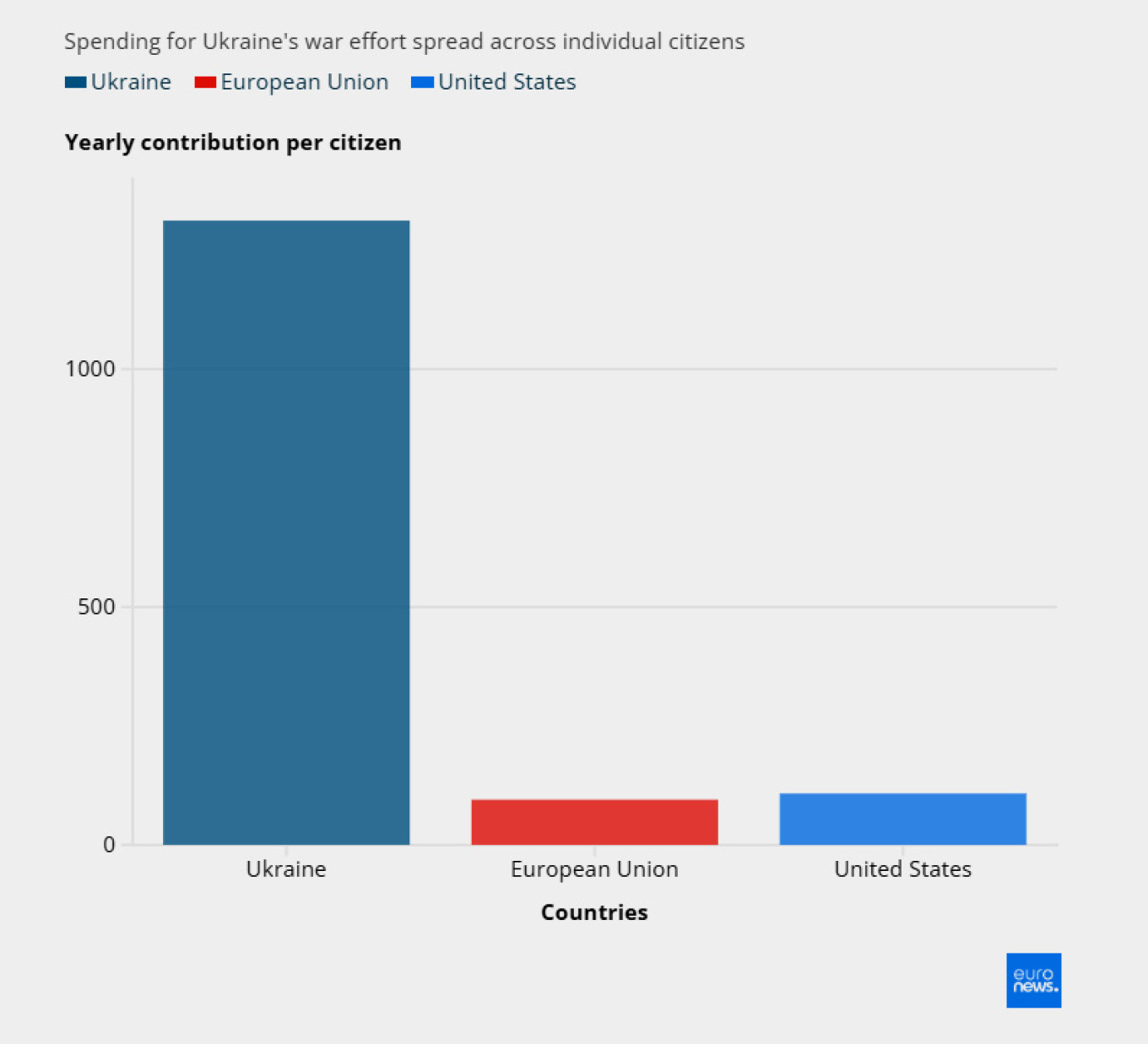 Αξίζει να σημειωθεί ότι οι μέσοι ετήσιοι μισθοί ανέρχονται σε 29.600 ευρώ στην ΕΕ και σε 56.880 ευρώ στις ΗΠΑ, γεγονός που καθιστά τη σύγκριση ακόμη πιο αποκαλυπτική για το βάρος που επωμίζονται οι Ουκρανοί.